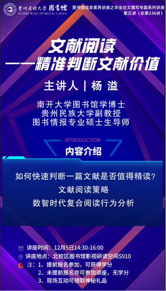 面对海量文献无从下手?读了一小时才发现这篇文章并不相关?在信息过载的时代,如何高效筛选、精读与整合知识?本学期图书馆信息素养讲座之毕业论文撰写专题系列讲座第五讲,特别邀请到杨溢老师(南开大学图书馆学博士、贵州民族大学副教授、图书情报硕士研究生导师)为大家带来讲座:文献阅读——精准判断文献价值,聚焦数智时代新工具与新思维,让每一次阅读,都指向更清晰的方向;告别盲目泛读,精准捕获价值文献!欢迎同学们踊跃参加!