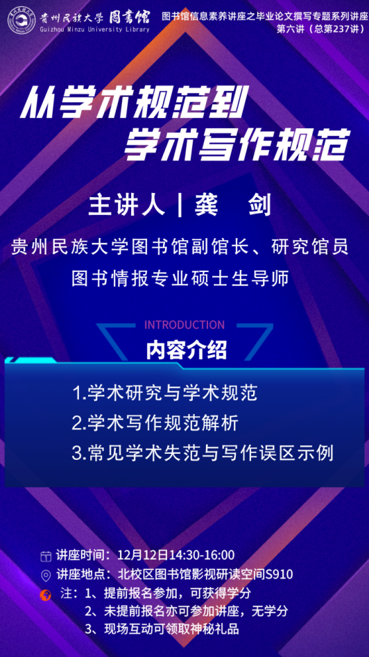 学术之路,始于规范,成于写作。规范是底线,是学术生涯的基石;写作是桥梁,将你的思想清晰有力地传递给世界。从严格遵守引用伦理,到巧妙构建论文逻辑;从避免无意抄袭,到打造精炼专业的学术语言——这其中的每一步,都至关重要。本学期图书馆信息素养讲座之毕业论文撰写专题系列讲座第六讲,特别邀请到龚剑老师(贵州民族大学图书馆副馆长、研究馆员、图书情报硕士研究生导师)为大家带来讲座:从学术规范到学术写作规范,让你的学术写作安全启航!欢迎同学们踊跃参加!