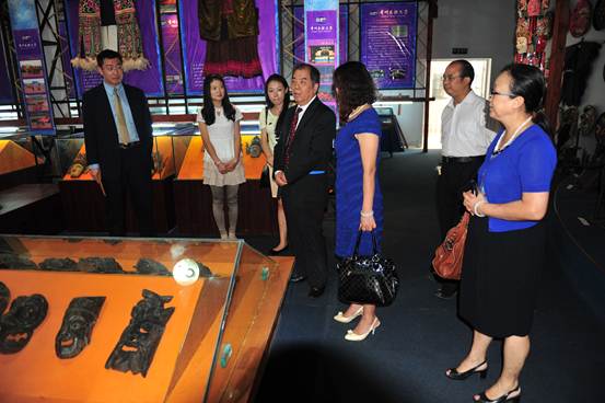 客人参观民族文化展示厅时与我校专家交流(左一为韩圣龙院长,右四为傅增友教授)
