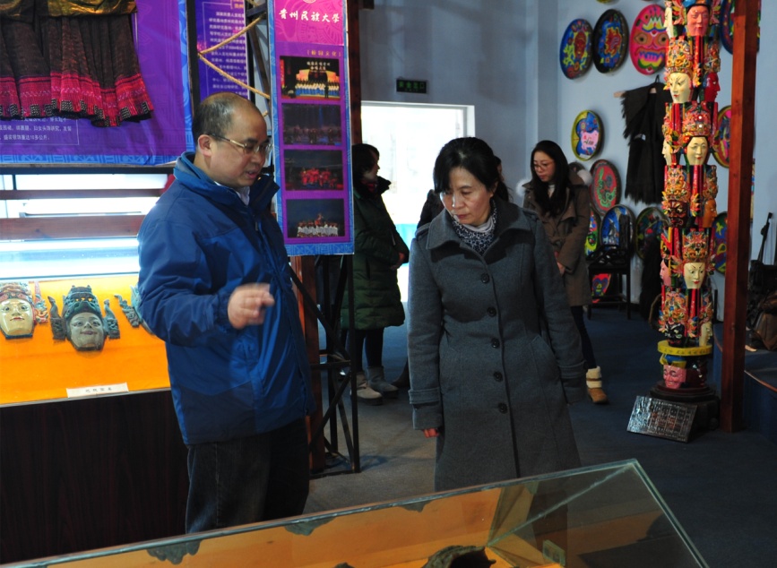 陈玉平书记在民族文化展示部给韦副校长讲解傩文化