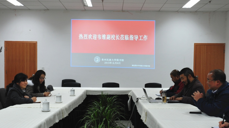 2015年元月6日下午,韦维副校长到我校图书馆调研指导工作,实地走访了图书馆民族文化展示部、特色资源部、文献资源建设部等部门,了解部门工作内容、工作程序和工作特点。