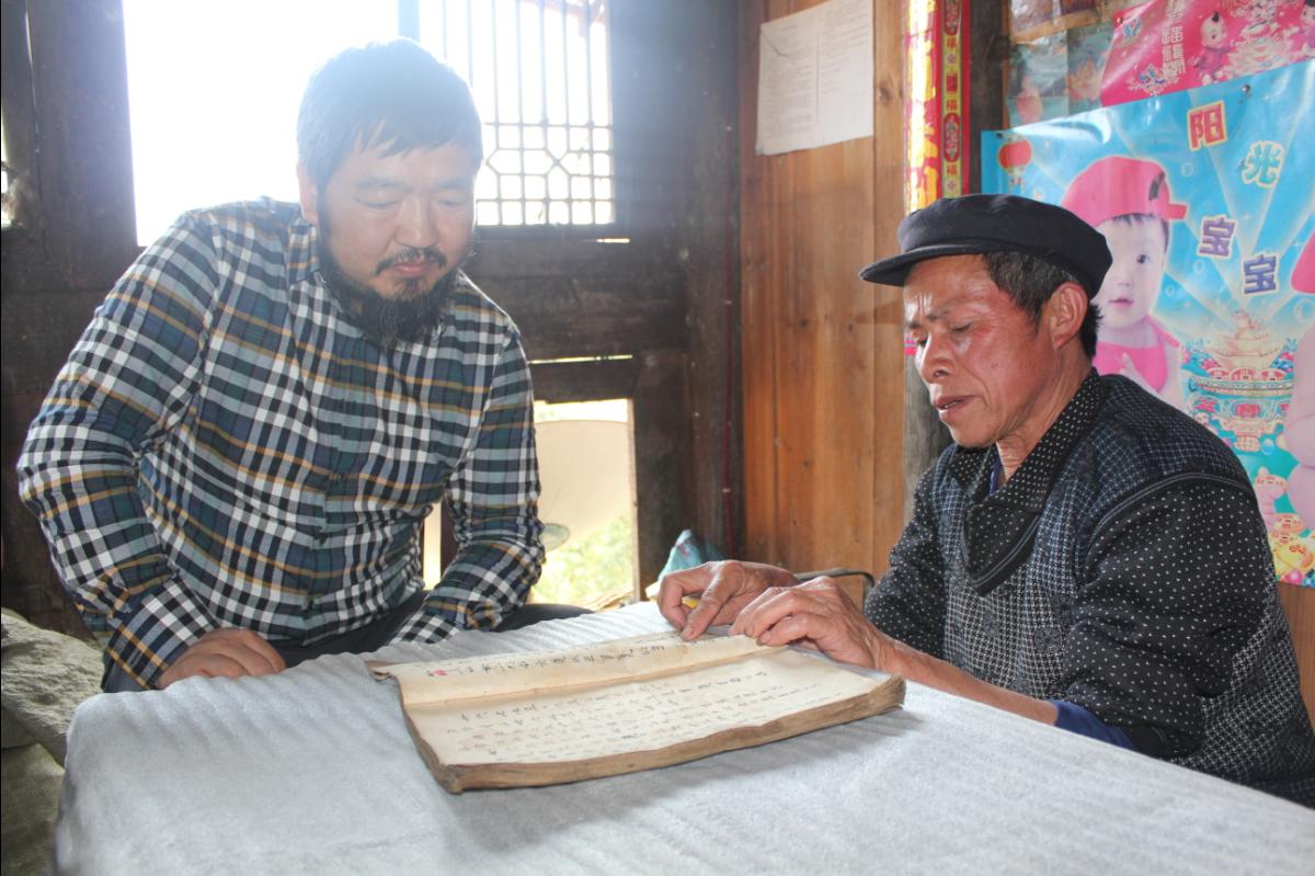 3月21日,调研组驱车来到300KM以外的榕江县三江水族乡下故依村水族老人石开荣家里,这是一个200余人的水族村寨,半山而栖,民风淳朴。石开荣老人是当地有名的水书先生,过去多年从事村会计工作,收藏、积累了大量地方文书和少量珍贵水书古籍资料。此次走访,老人向我馆捐赠了数百件地方文书,并把自己一直保藏的珍贵水书古籍资料借予我馆数字化。