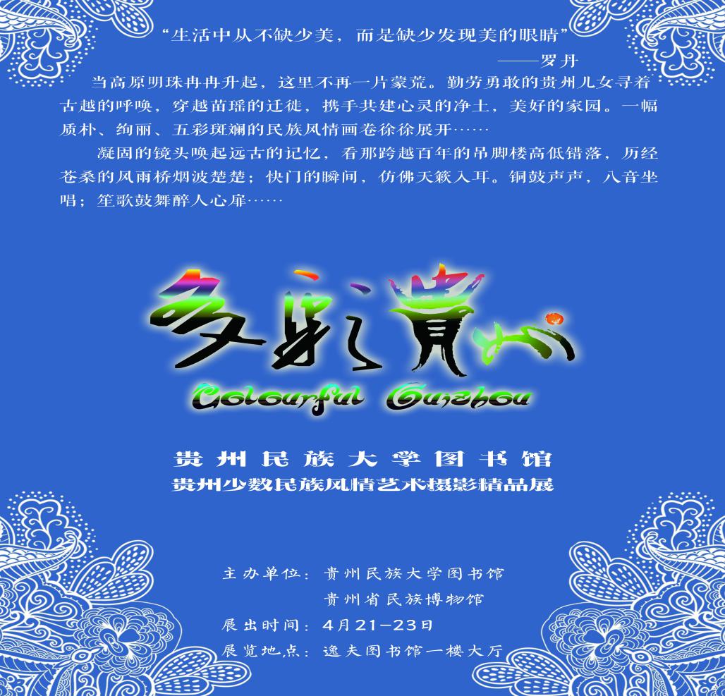 民族文化展示部结合4•23--“传统文化与经典阅读”的活动主题,为了让广大师生了解贵州民族文化、热爱民族文化,树立坚定的民族自信心,在现代化、多元化的时代保持清醒的自我意识和独特民族个性,弘扬民族精神,特举办贵州少数民族风情摄影精品展和民族文化知识讲座活动,欢迎广大师生踊跃参加。