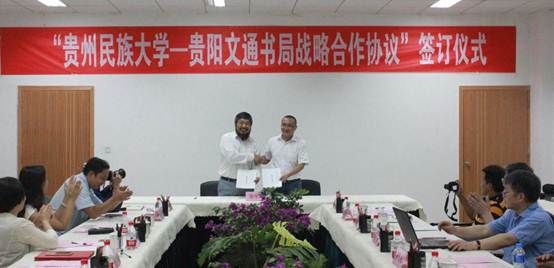 卢馆长和舒奇峰先生签字仪式上分别代表贵州民族大学与贵阳文通书局在协议上签字。