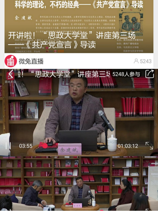 《科学的理论,不朽的经典——<共产党宣言>导读》讲座在贵州广播电视台《百姓关注》栏目“微兔gogo”APP平台同步直播,目前网络收看量5千+,反响较好。
