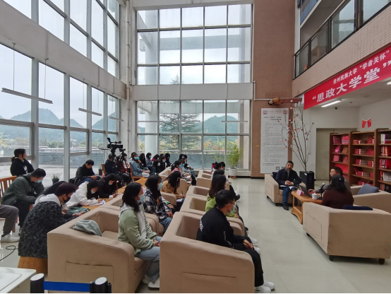 2021年10月29日下午,在逸夫图书馆一楼,以《科学的理论,不朽的经典——<共产党宣言>导读》为主题的“思政大学堂”系列讲座第三讲开讲。此次讲座特邀贵州民族大学马克思主义学院余建斌教授作为主讲嘉宾。图书馆馆长卢云辉主持。来自马克思主义学院近四十名师生现场聆听。贵州广播电视台微兔客户端同步直播。