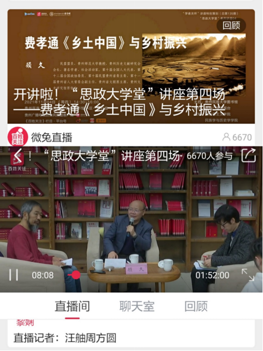 “费孝通《乡土中国》与乡村振兴”讲座在贵州广播电视台《百姓关注》栏目“微兔gogo”APP、微博、新浪、头条等新媒体平台同步直播,收看量6000+,且后期回顾在线观众一直不断攀升,反响较好。