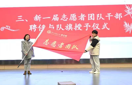 随后,进行新一届志愿者干部聘任仪式,副馆长龚剑为新团队授予了队旗,新任副会长王垚庄重地接过队旗。这面队旗不仅象征着志愿服务的传承,更寄托着对新团队续写服务篇章、助力书香校园建设的殷切期望。