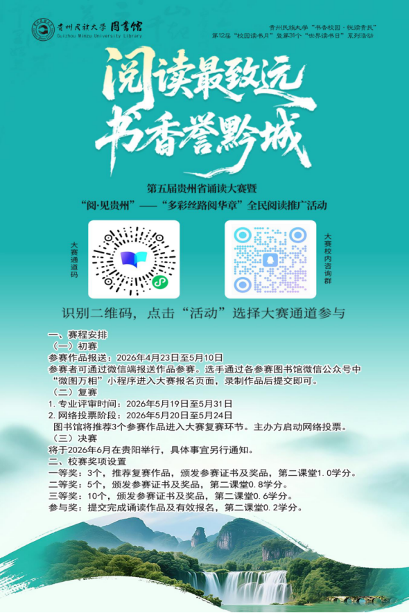为深入贯彻落实党的二十大和二十届历次全会重要精神及党中央关于全民阅读、建设书香社会的重要部署,全面贯彻《全民阅读促进条例》,在“十五五”规划开局之年,贵州省图书馆、省图书馆学会、省高等学校图书馆工作指导委员会拟联合全省各级各类图书馆开展“阅读最致远·书香誉黔城”第五届贵州省诵读大赛暨“阅•见贵州”——“多彩丝路阅华章”全民阅读推广活动。本活动旨在以诵读的力量,引导读者演绎经典作品,感受贵州大地的文化温度与民族融合之美,让黔山秀水的文化记忆与时代精神交相辉映,进一步铸牢中华民族共同体意识,凝聚起团结奋进、书香润城的强大精神合力,为建设书香贵州、构建全民阅读促进体系,强化主阵地引领作用,在中国式现代化进程中展现图书馆的责任与担当。相关事宜通知如下: