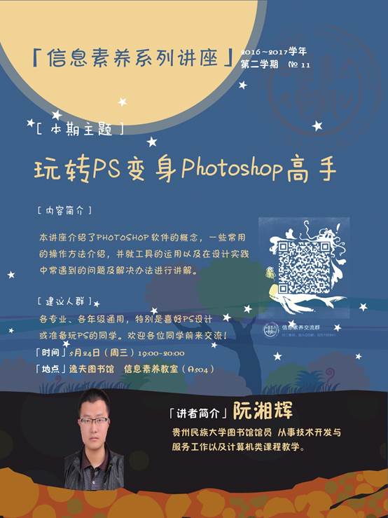 主 讲 人:阮湘辉,贵州民族大学馆员 从事技术开发与服务工作以及计算机类课程教学。