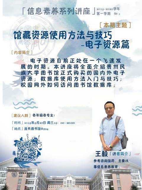内容简介:电子资源目前正处在一个飞速发展的时期。本讲座将全面介绍贵州民族大学图书馆正式购买的国内外电子资源;数据库使用方法入门与技巧;校园网外如何访问图书馆数据库;